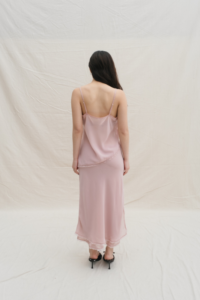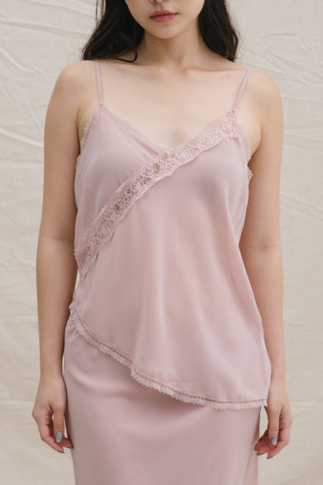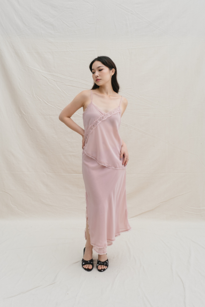 A dreamy, romantic set that combines soft femininity with a modern edge. Featuring a delicate lace-trimmed camisole with a unique diagonal drape and a matching flowy maxi skirt, this set is designed to move beautifully with you. Whether you're attending a garden party or an intimate dinner, it’s the ultimate "effortless glam" outfit.