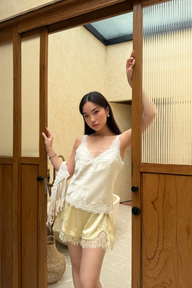 Your not-so-basic slip top with elevated lace details. Designed with a relaxed fit and delicate trims along the neckline and hem, this piece feels light, flowy, and subtly elegant. Wear it on its own or layer it under outerwear for an effortless chic look.